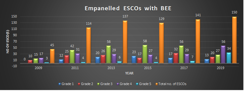 BEE does empanelment of ESCOs through a process of grading carried out by SEBI Accredited rating agencies CRISIL/ CARE Advisory Research & Training Ltd /ICRA Analytics Ltd. indicating capability in implementation of energy efficiency projects through performance contracting based on availability of technical manpower, financial strength, market position etc. Currently, 127 ESCOs are empaneled by BEE. The energy efficiency market in India is estimated to be worth INR 150,000 Crore, out of which only 5% potential has been tapped by ESCOs so far. Accordingly, a significant Energy Efficiency potential is left untapped in India and ESCOs are supposed to be the main vehicle to harness this potential.