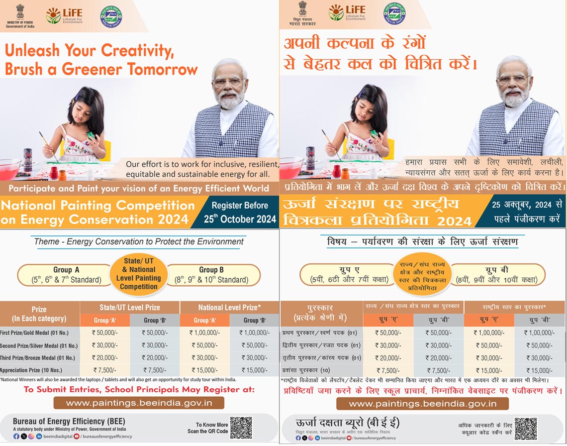 The Ministry of Power has launched the National Painting Competition in the year 2005 under the National Awareness Campaign to promote energy conservation in the country for students of 4th, 5th and 6th standards. Painting competition for students at the School, State and at National level has been included as one of the activities of the campaign, which would not only make aware the children about the need of conserving energy but at the same time would educate and involve their parents as well in the above cause. The identified activity is one of the measures, which can help in creating awareness in the domestic sector. In order to strengthen and for added cognizance, higher classes of 7th, 8th and 9th standards have been included from 2013 in addition to existing classes of 4th, 5th and 6th Standards.